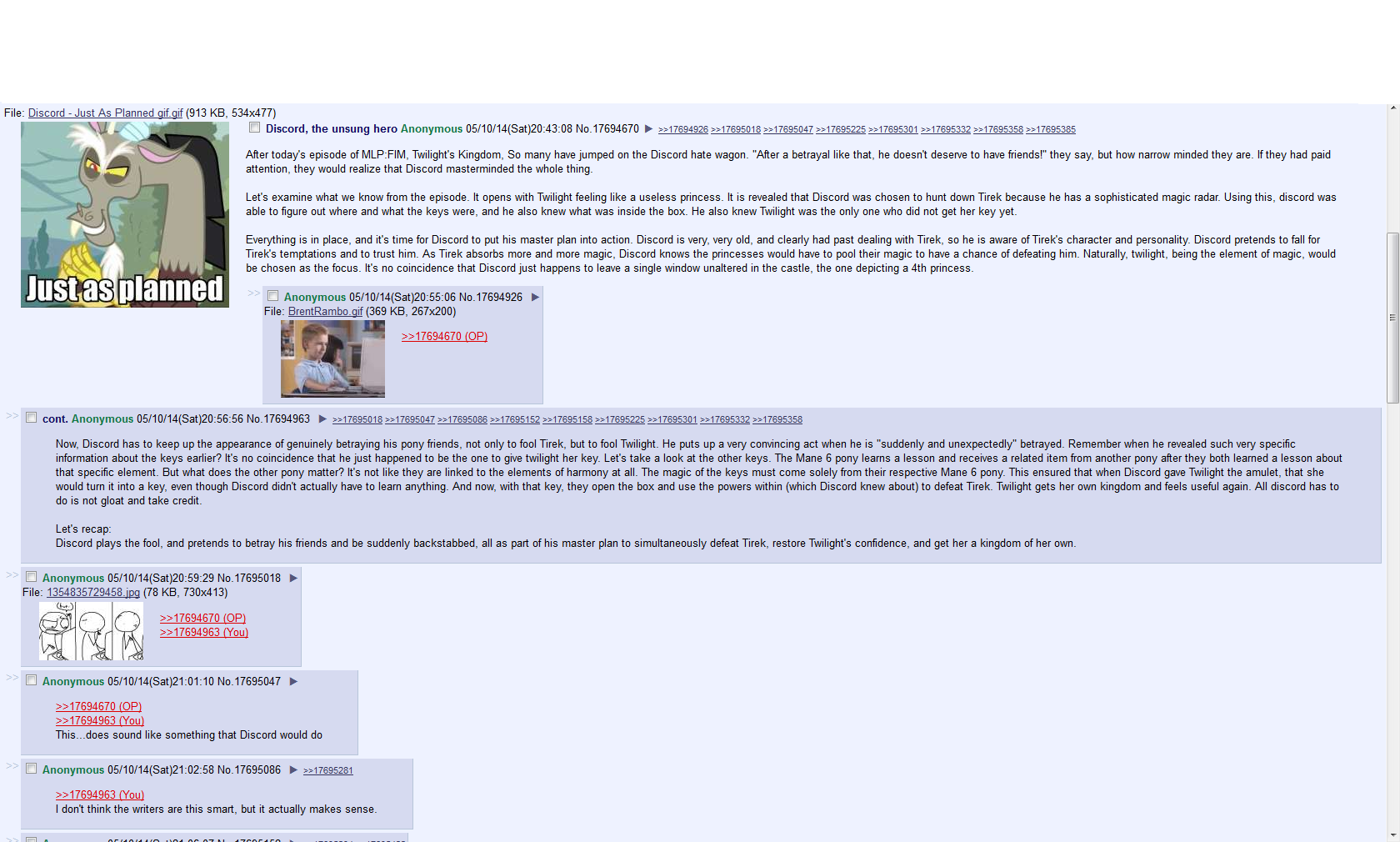 I mean really for me i think i'm leaning more towards the discord planned this route this whole season he had been showing up rather randomly to do stuff and try the ponies patience testing their friendships with him as it were. The question here is why? Was he just that Curious or did he have this in the works the whole time? He knew things about the tree of Harmony obviously from the get go and seemed to be manipulating things in a way that we couldn't quite see, or at least i felt some of the episodes implied. SO as of this moment i'm leaning more towards the Discord planned this for some reason idea. What his motivation in planning it is would still be unknown.