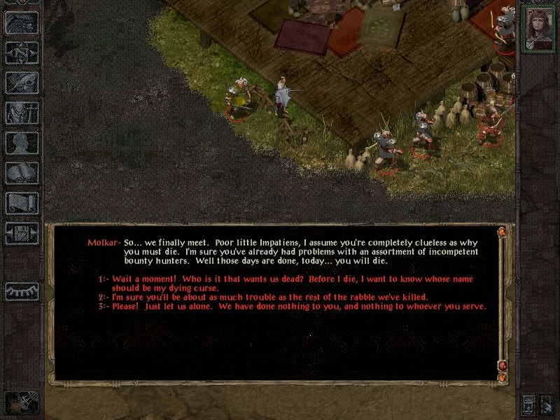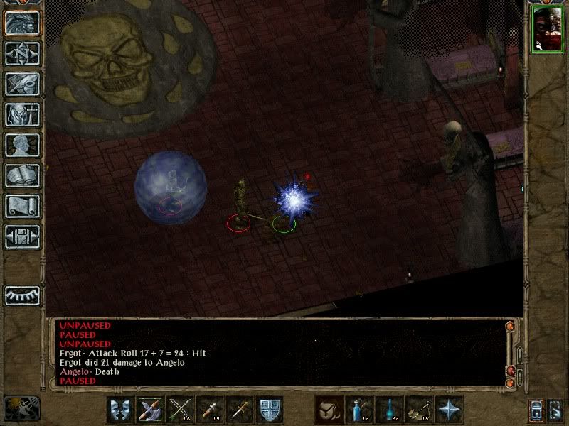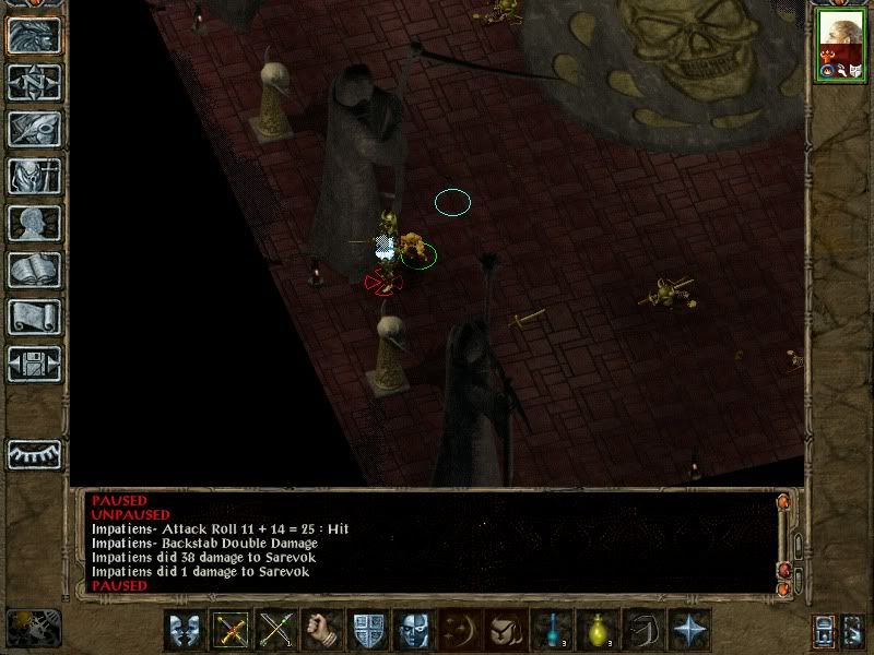 - At the temple Impatiens dispelled Sarevok's haste and then led him into a corner (knowing all the others but Angelo would follow). Used potion of magic shielding against Angelo (to try and stop him from going invisible in response to scroll of magic protection). This did mean he did a bit more damage than was comfortable and forced Impatiens to run away and heal a bit before applying the finishing touches. She had just enough arrows of detonation to kill the other 3 acolytes near Sarevok (firing from stealth) and then half a dozen or so quick backstabs round the pillars accounted for the big guy.