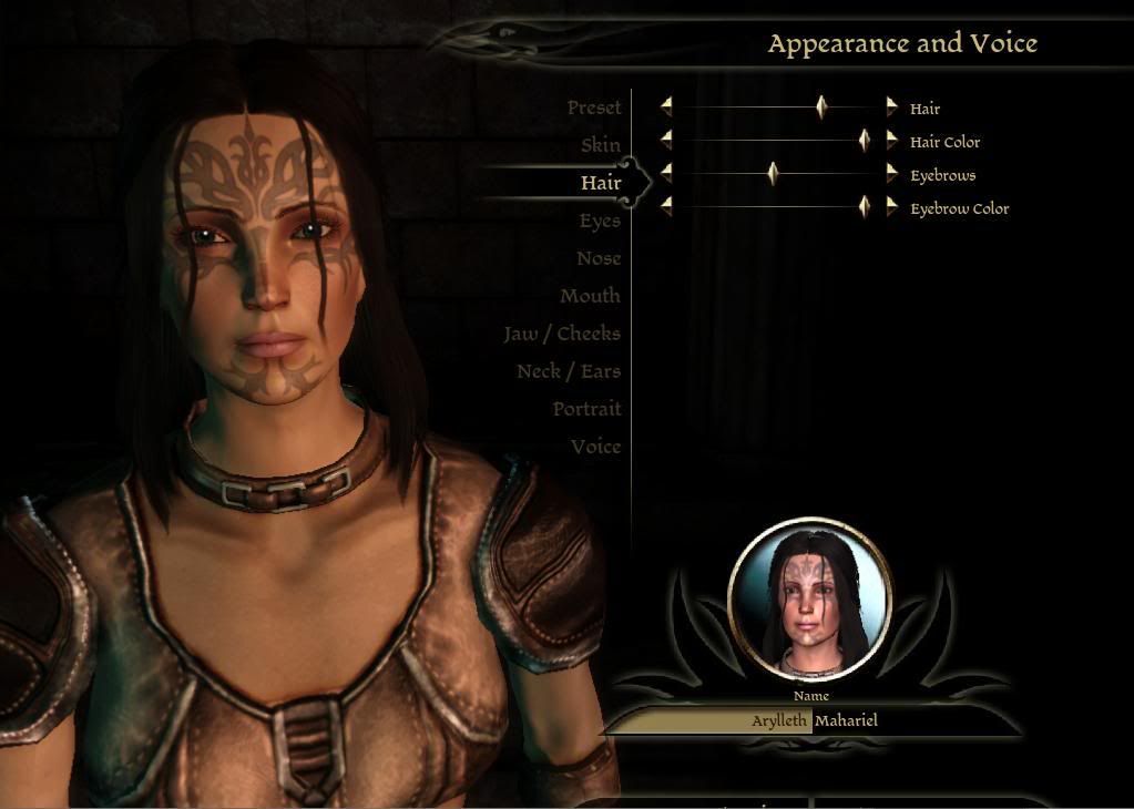 It is really easy to make an attractive PC. It is interesting that sliders can be vastly different between the races. It seemed like elves had a lot more variety in features (i.e. noses) than humans. I would also like to know which of the elven pantheon relates to each of the tattoos because there are definitely some that I do not want to be affiliated with depending on how I want to role play my character. Plus I would like some color variation in the tattoos, maybe some greens or reds. But overall I really love the character creator.