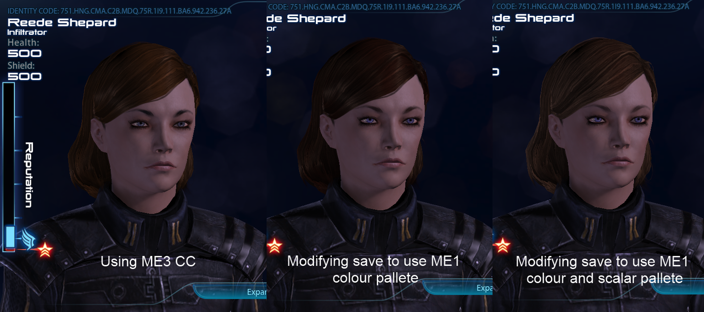 Left is original that ME3 CC set up. Right is my modded version using ME1 colour pallete. Notice how the face code is the same. These are the colour values from ME1, not ME2. I'm going to try experimenting with some of the other values soon.