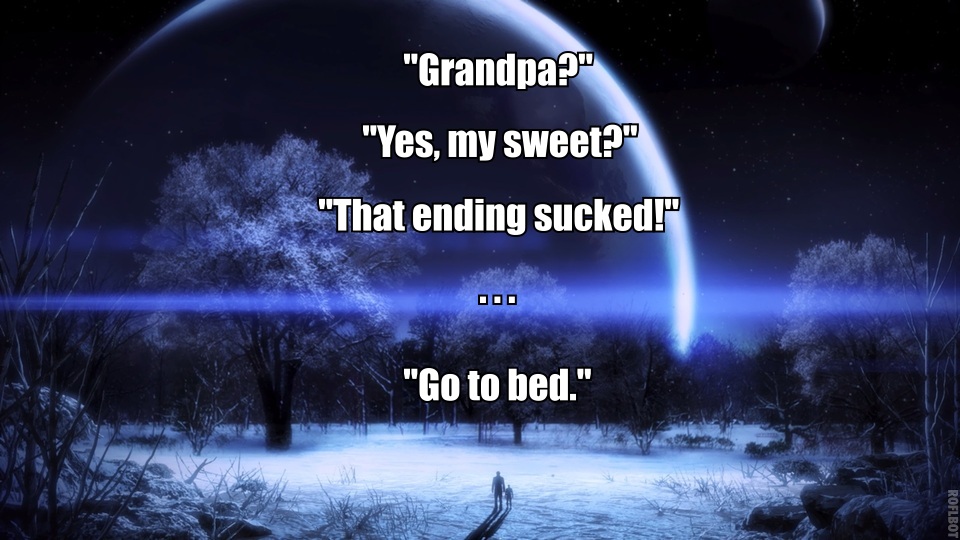 Ich warte noch auf ein richtige Ende von ME3. Denn das was ihr geliefert habt war absolut schlecht. Nicht nur vom Erzählerischen Stil, nicht nur von den Logiklöchern sondern auch im Umgang mit euren "Kunden" oder wie ihr uns scheinbar eher seht "Konsumtenschafe".