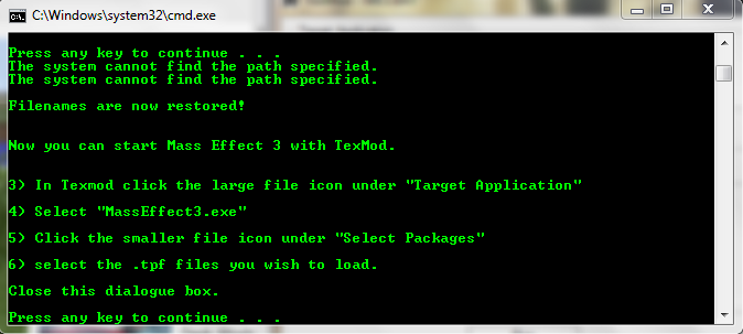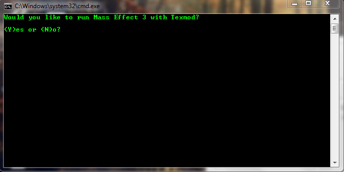 Edit: Okay, so I removed the ME3 exe from the Win32, placed the texmod in its place and changed the name to MassEffect3, then placed the actual ME3 exe back into the Win32. I launched Origin, launched Mass Effect, and it was actually able to launch Texmod. I selected the ME3 exe, my mod, and tried to launch the game. Nothing happens. It sits there at this point http://i1098.photobu...zps15865da2.png