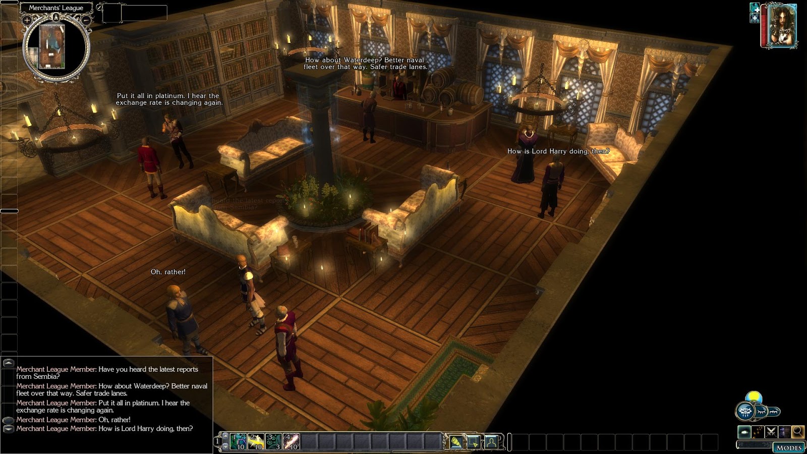 PJ: It is a heartbeat script, and I have it set to change the duration of the heartbeat to between 8 and 20 seconds rather than 6, though I may increase the number. There is a conversation in another room here, and I think it is within earshot to make the text appear in the chat log, so based on what you say, I'll add a little check in the heartbeat to abort if the player is currently in conversation. That way, they won't be interjecting within the conversation.