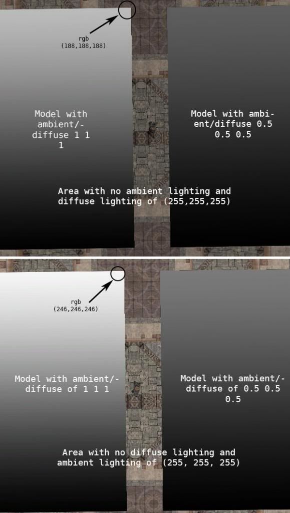 But wait, that was both diffuse and ambient at 255 (totalling 510), and we all know there's only 256 shades of gray in 24-bit textures. Could it then be more appropriate to use something else - as in rgb(128,128,128)?