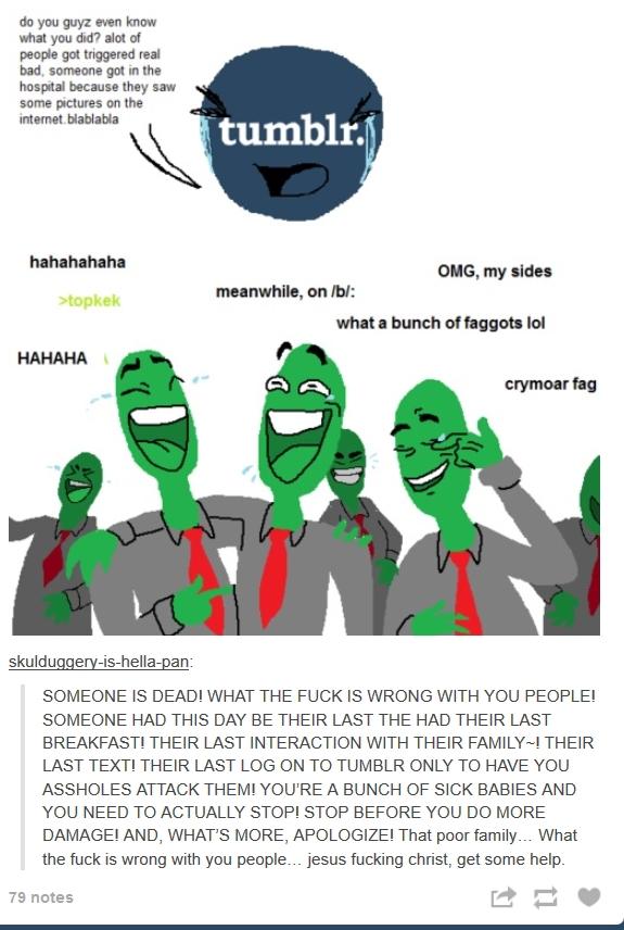 Oh yeah, don't get me wrong 4chan has done some **** but they look like glorious avenging angels compared to Tumblr.