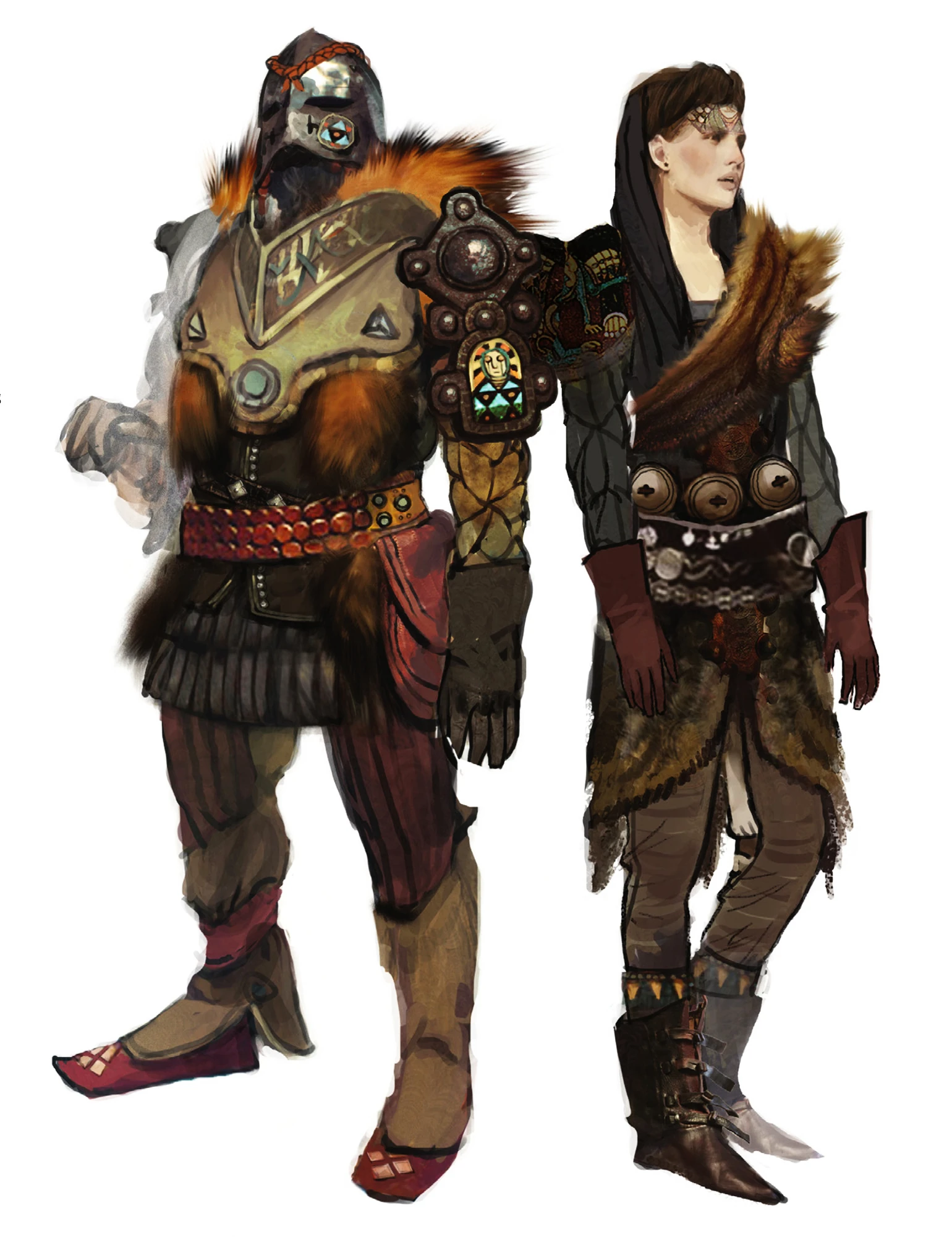 Though, Fereldan fashion seem more a mixture of warm and dark colors than the cool and dark colors of the Imperium barring gold. The latter also have more of a design emphasis on sharps and edges while the former have more of a design emphasis on fur and rough cloth;