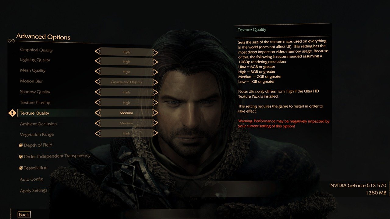 I'm going to check when I get home, but I think I have ultra with 3GB of VRAM. I could be mistaken. I played most of last week in a Nyquil haze. Regardless, the graphics in SOM are pretty amazing, but the story so far is kind of weak. I'd rather have slightly lower graphics and a great story. Then later I can patch up the graphics.