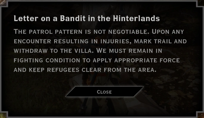 Same for me. I usually clear out the East Road Bandits on my way to my first visit to Redcliffe, so that's where I usually get it.I've found the letter in two places: during The East Road Bandits by the Dusklight Camp, and by that big cluster of bandits south of that open air pavillion where Cassandra's rogue templar is in Hafter's Woods.