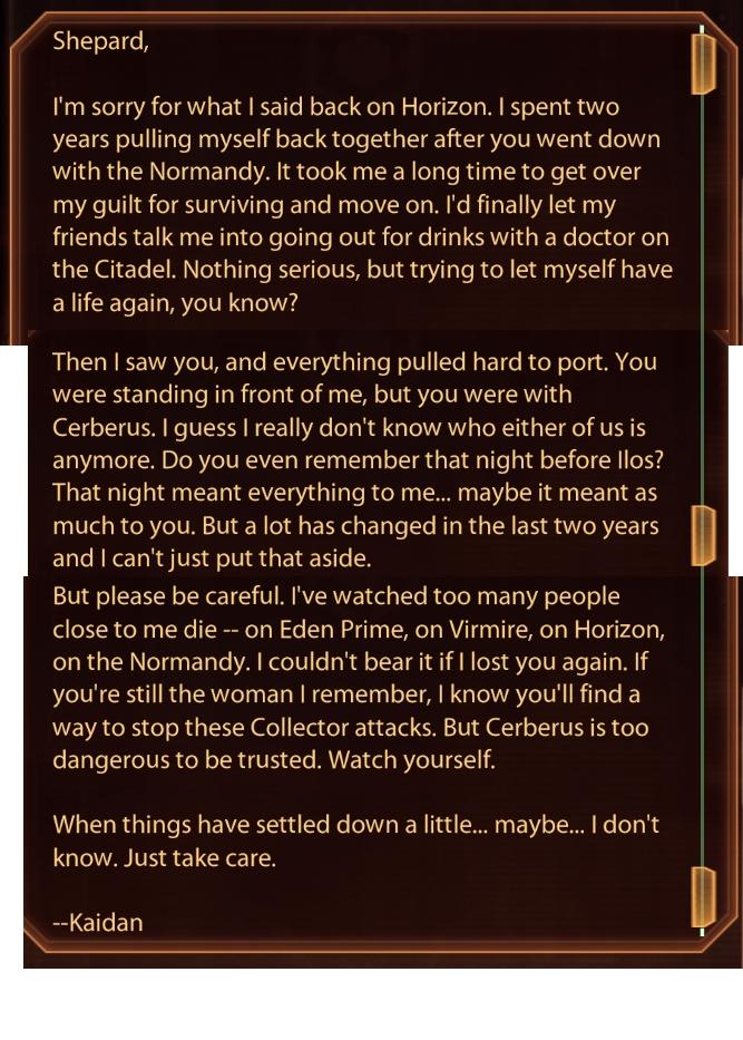 Re: Annakie: yep, the email from Kaidan made all the difference to me after Horizon. I was hella pissed at first, and thought it was a horrible cop out to have Kaidan behave that way when Tali and Garrus were fine with joining Cerberus. Now I'm okay with it, and the Kaidan message is the only one I leave unread in all my playthroughs.