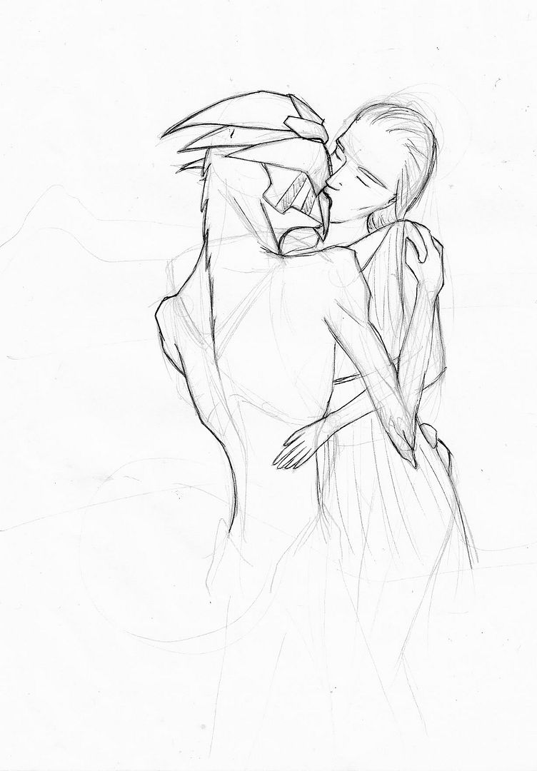 I was surprised, really, because these are some of the most vague scribbles I've drawn. You can see them here. The only thing about Mass Effect he has ever seen are my sketches of Turians, so I found his final result kinda amazing. Before he started, he asked me: "How do you make out with them, anyway?" My answer: "Well... You can, just trust me." xDD Later while he was drawing he stated that "He had no idea how their bodies were, but he was gonna draw him a precious ass", but in the end he didn't draw that far =D. Still amusing though.