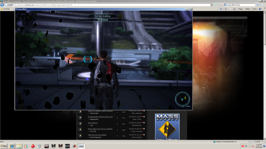 I just installed Mass Effect 1 and get these black spots on the screen that flash for a second then go away. The problem is that every second new ones come then promptly dissappear. The end result is it looks like black static. Each individual black thing looks like burning film (if you've ever seen that).
