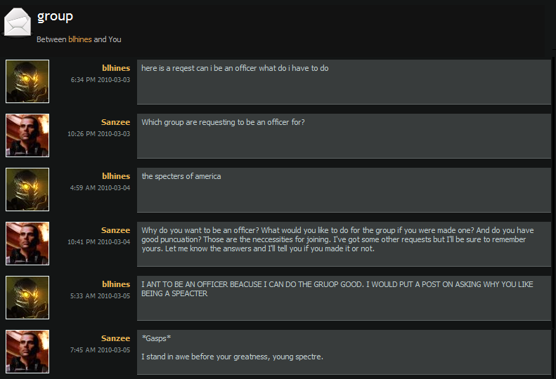 Well, I guess the other member didn't mean anything bad. Being a group owner myself, for now, I was in no trouble. Perhaps for the main reason that I know pretty well everyone that stops by. It's also a particular group not just anyone would want to enter just for being part of a group. It's a challenge on its own. But BioWare gave us this possibility, and I like it.