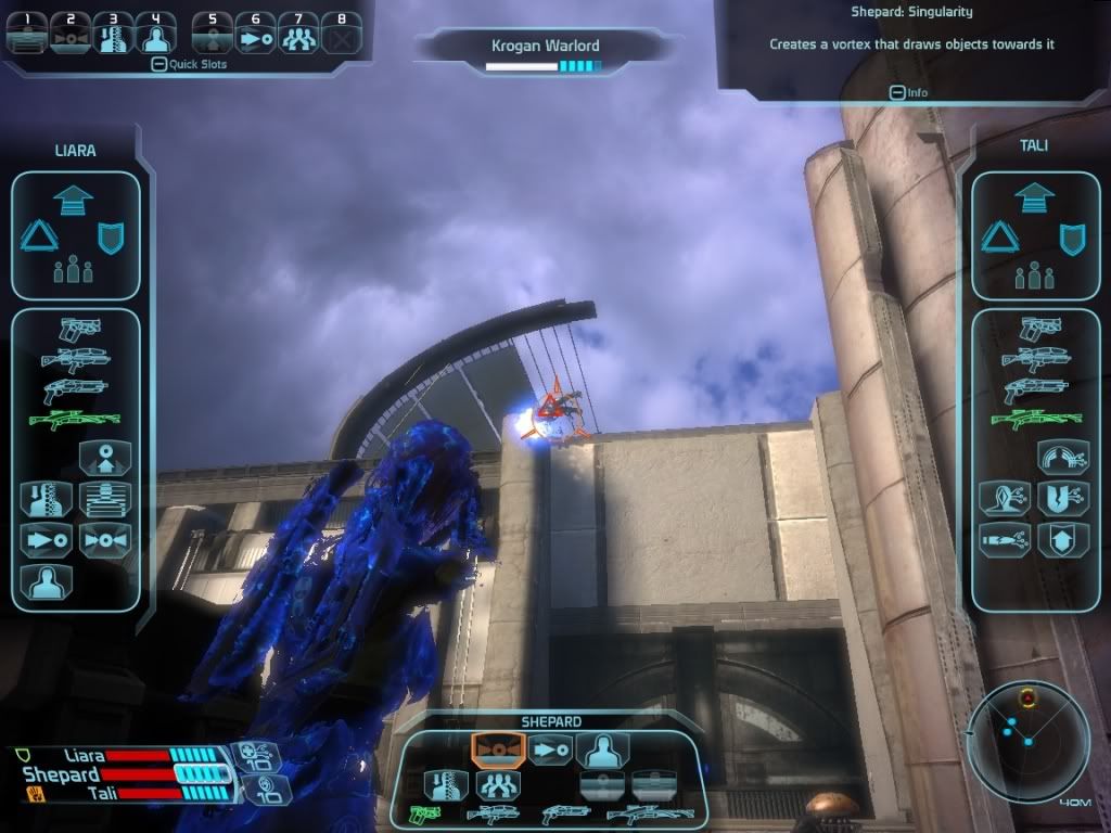 Some enemies like krogan are extremely heavy and it's difficult to lift them high above the ground, whether you use singularity or lift. However, if enemies are moving, you can use their own kinetic energy to empower the singularity or lift. This way you can lift enemies far higher above the ground than if you cast the spells with them just standing around. Krogan and geth destroyers are known to storm towards you, developing incredible kinetic energy. If you can use their entire energy to empower your lift or singularity, you can throw them 50 metres above the ground. Even if they hit a wall, the damage dealt by lift or singularity is incredible, since they hit the wall at full speed. Use decryption to overheat their weapons to prevent them from shooting you while they storm towards your location.
